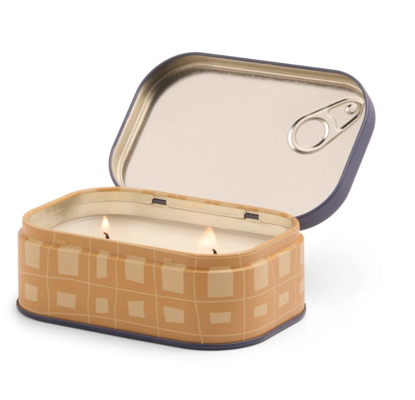 - Design: Faux pull-tab lid inspired by vintage sardine tins with hand-illustrated artwork