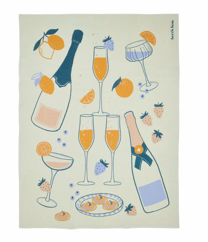 - Design: Pale blue tea towel with hand-drawn Celebration illustration with champagne, prosecco & fruit