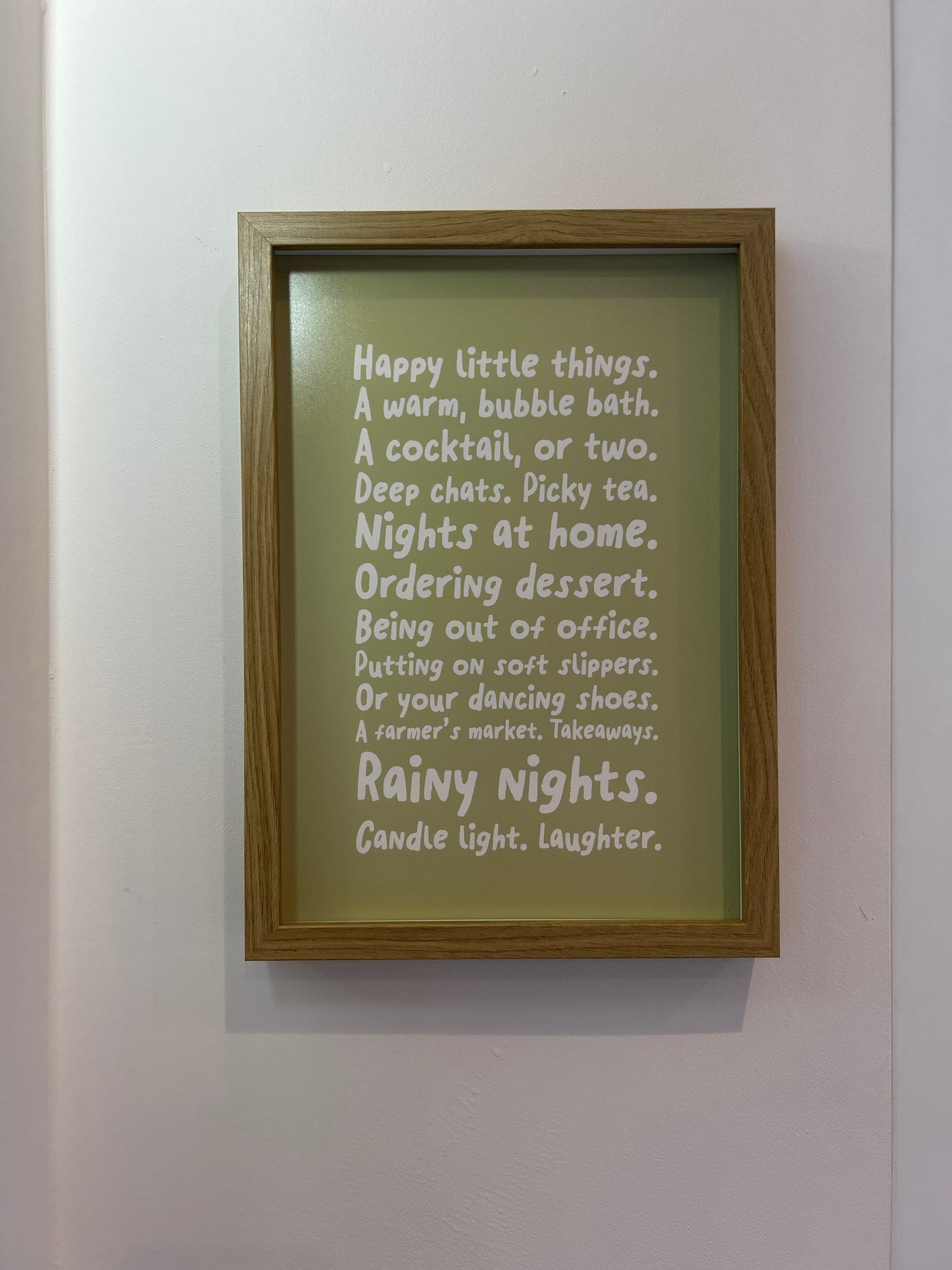 Celebrate life’s simple joys with the Happy Little Things Print in sage green, a charming design perfect for adding a subtle, uplifting touch to any space. Printed on high-quality 280gsm semi-gloss card, this artwork combines whimsical details with calming, natural tones.