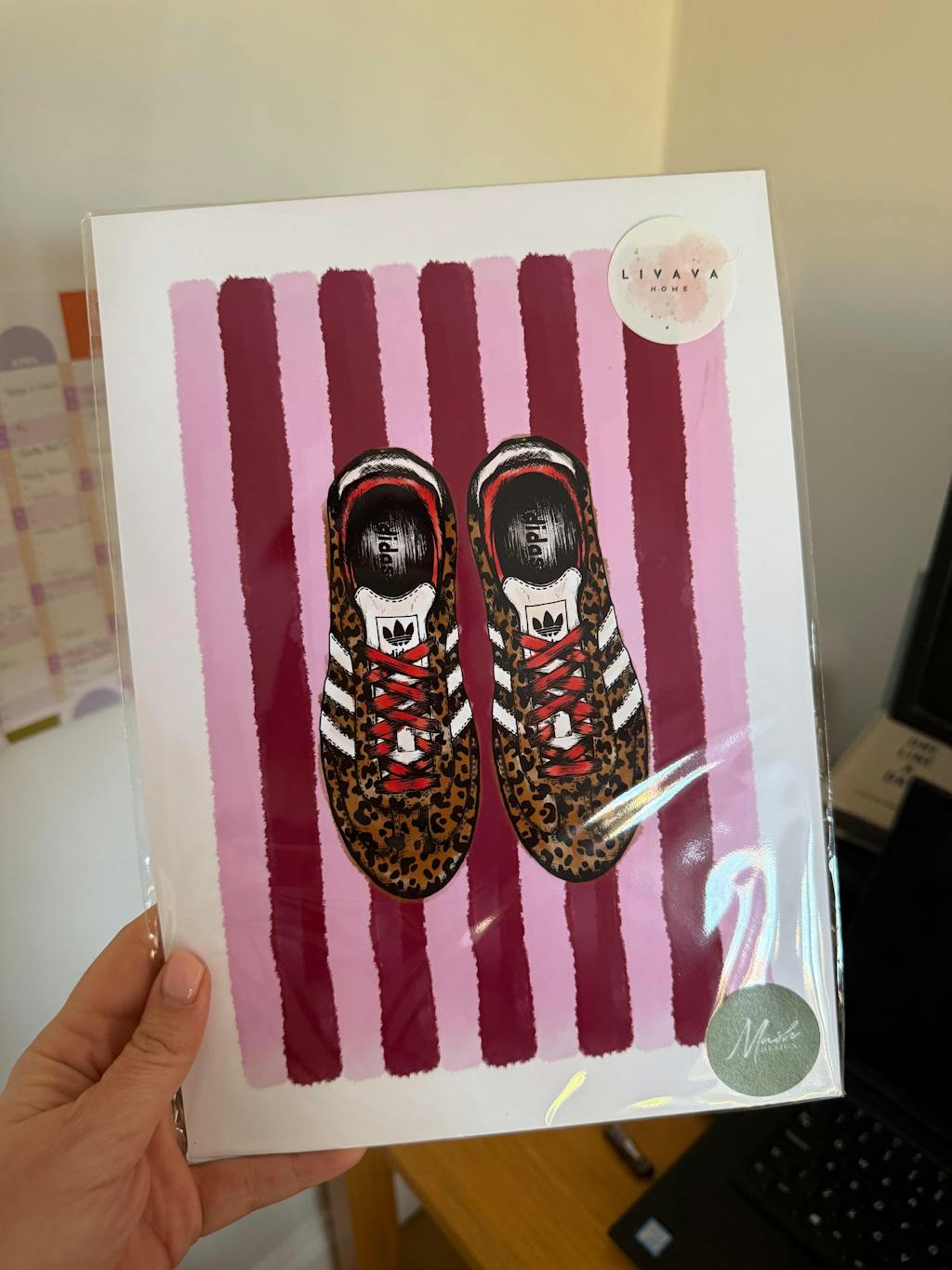 Celebrate classic trainer style with this Adidas Samba Stripe Print. Featuring a detailed illustration of the Leopard Adidas Samba trainers set against a bold pink and burgundy striped background, this artwork blends sporty nostalgia with modern design. This print adds a contemporary edge to any wall. Printed on high-quality paper with vivid colour and fine detail, it’s an ideal piece for gifting or styling your own space.