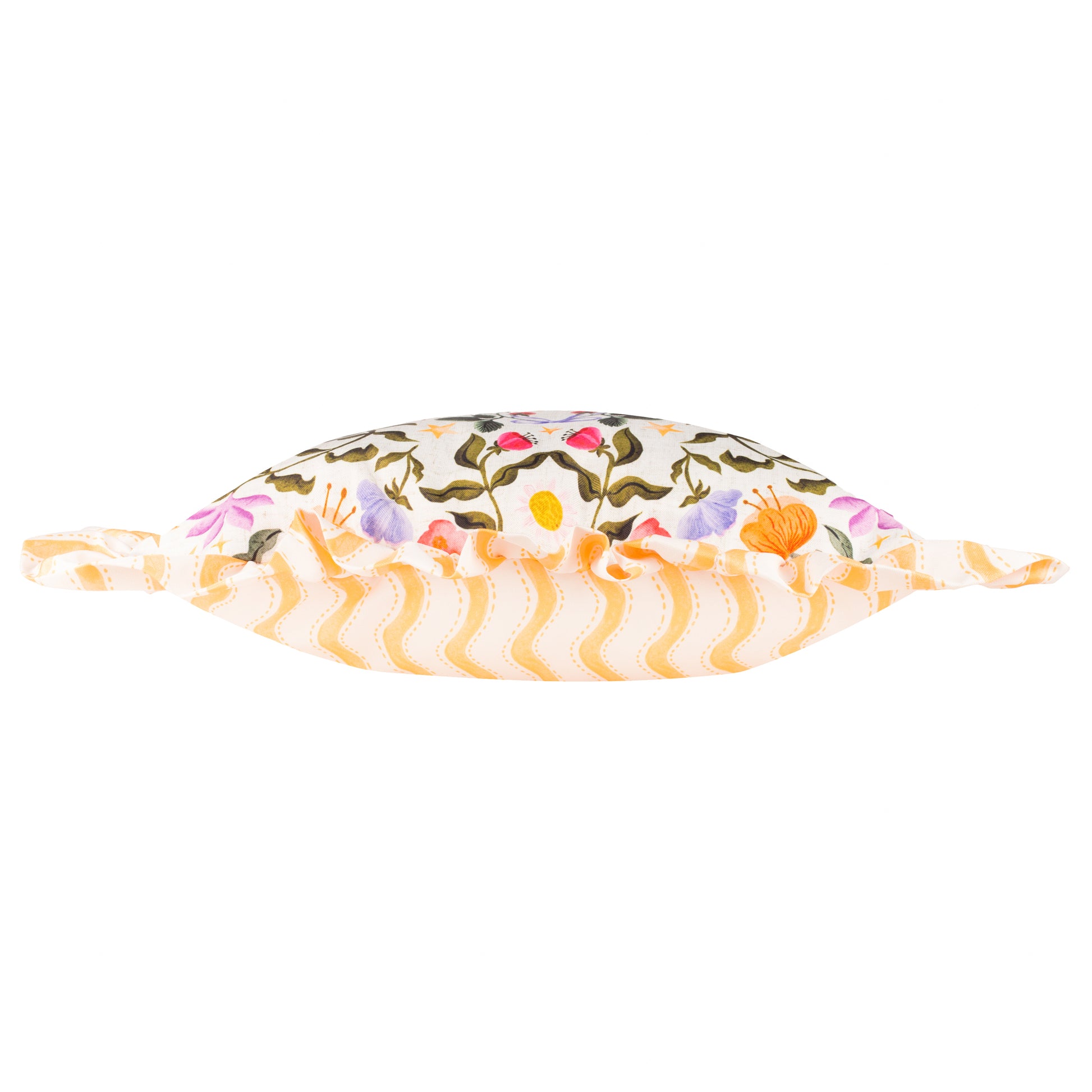 Add sunshine to your outdoor seating with the Summer Solstice Floral Sun Cushion. This 50x50cm cushion features a bright floral sun design on one side and a playful yellow wiggly stripe on the reverse, with a decorative frill around the edges for added charm.